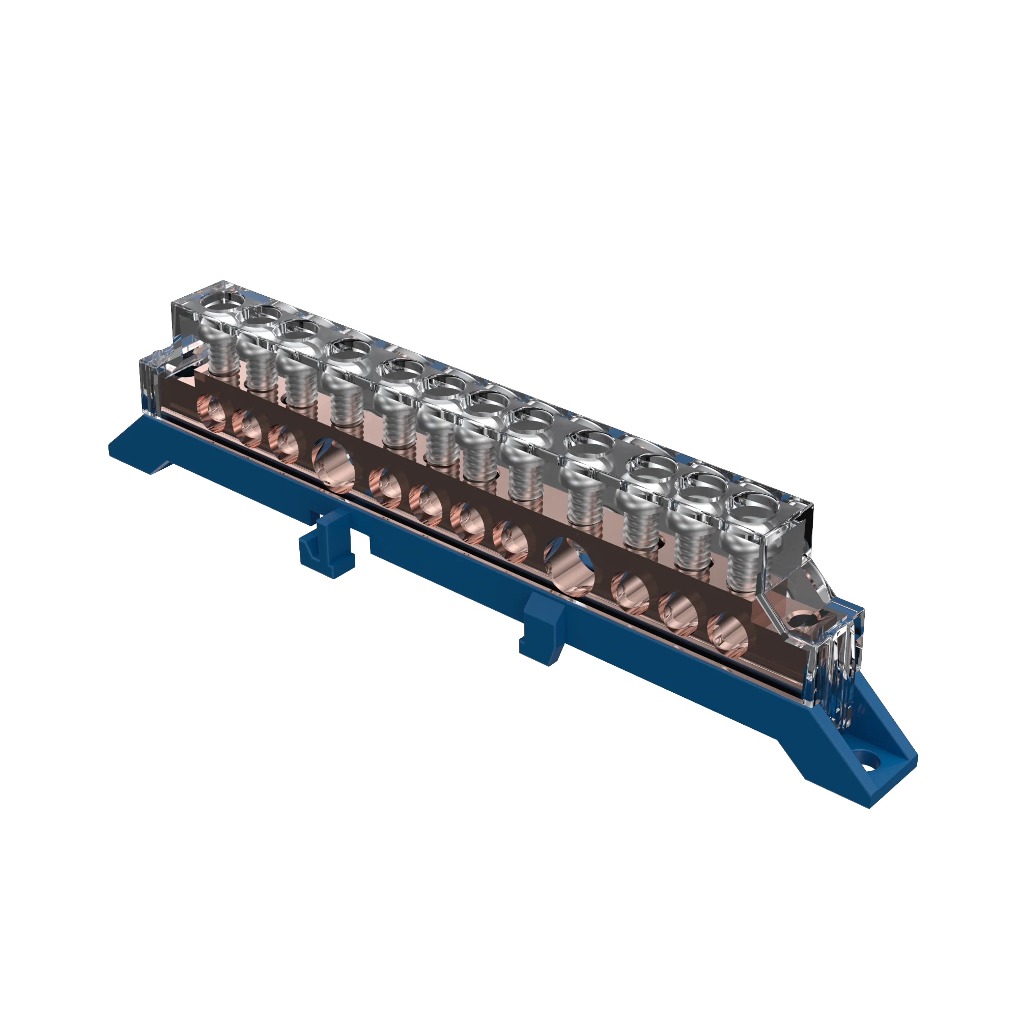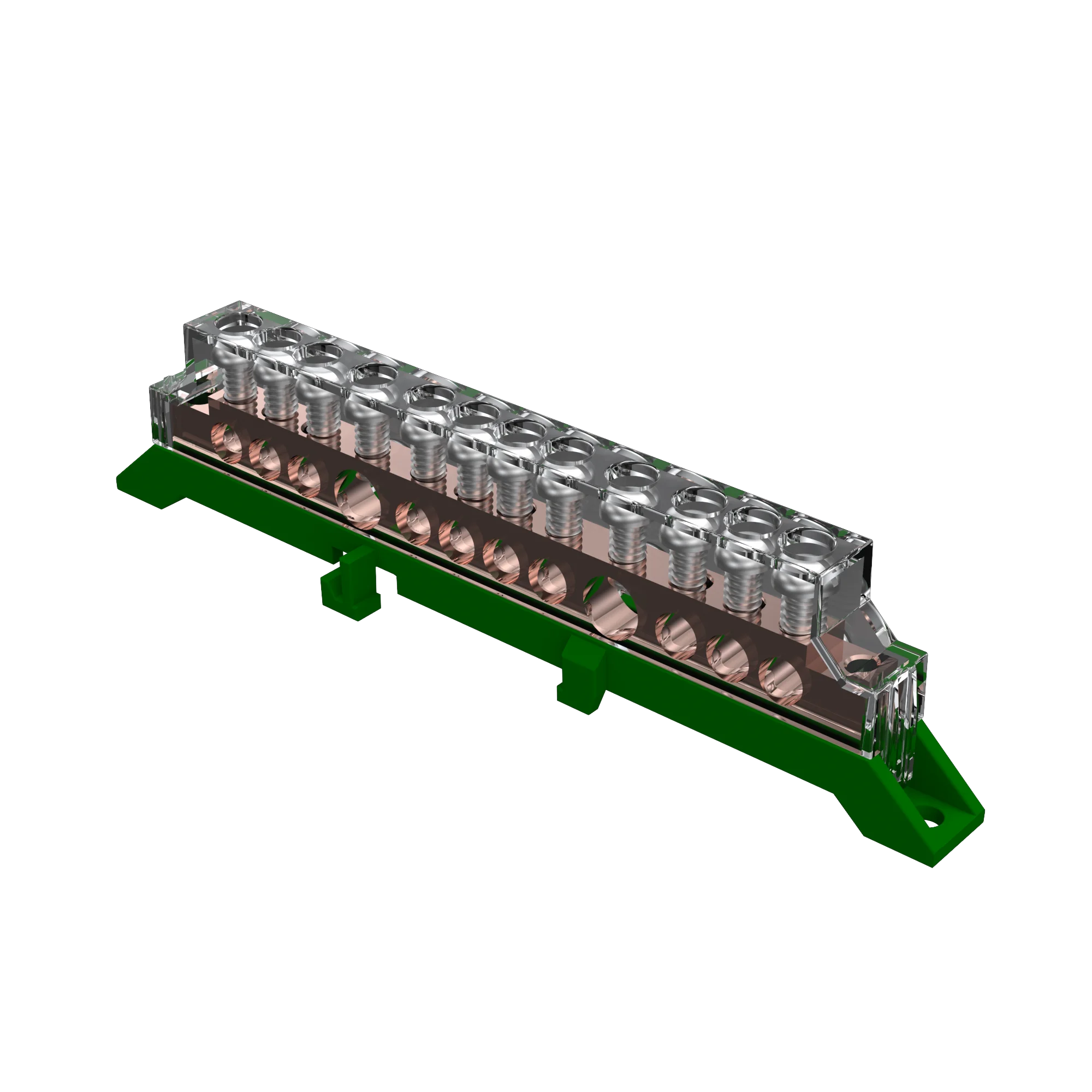 Bornera de conexionado con 12 agujeros, apta para ser atornillada o utilizada directamente sobre riel DIN.