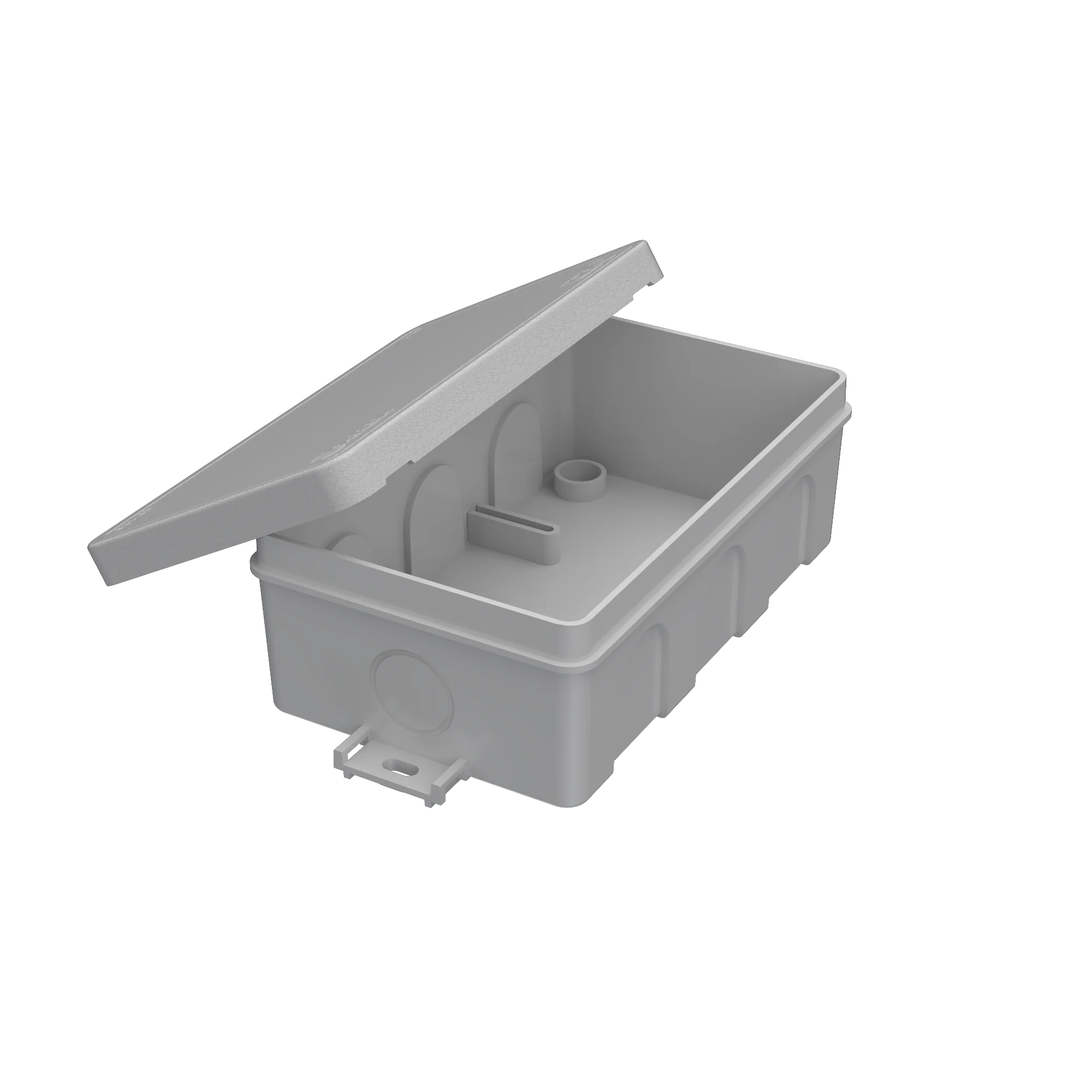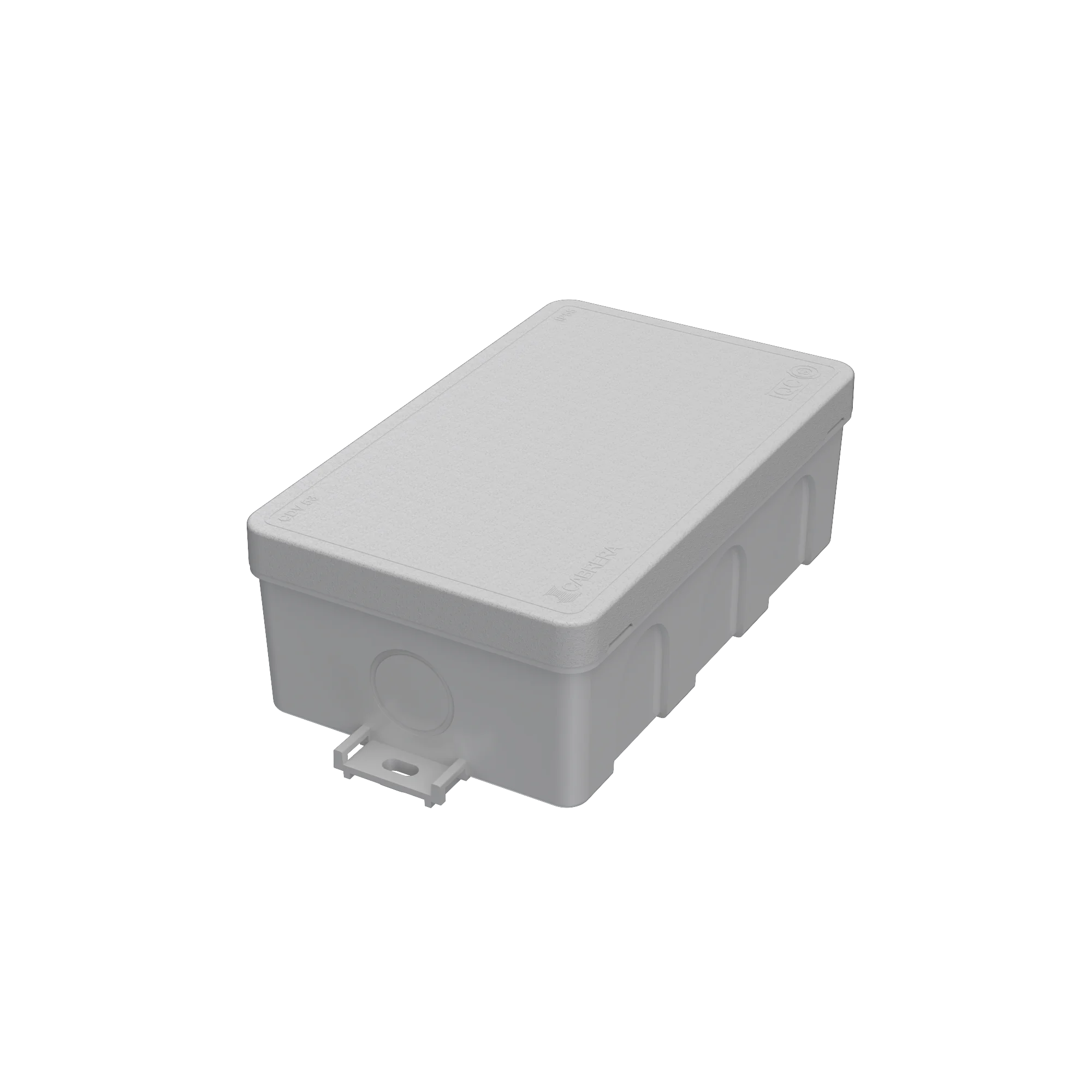 Caja de empalme con tapa a presión y posibilidad de fijación utilizando sus pestañas externas. Es posible incluso de fijar la caja a una cañería pasando un precinto por los alojamientos disponibles en sus pestañas externas. Cuenta en su interior con una estructura que permite la fijación de algunos componentes, sin perjudicar la aislación del producto.