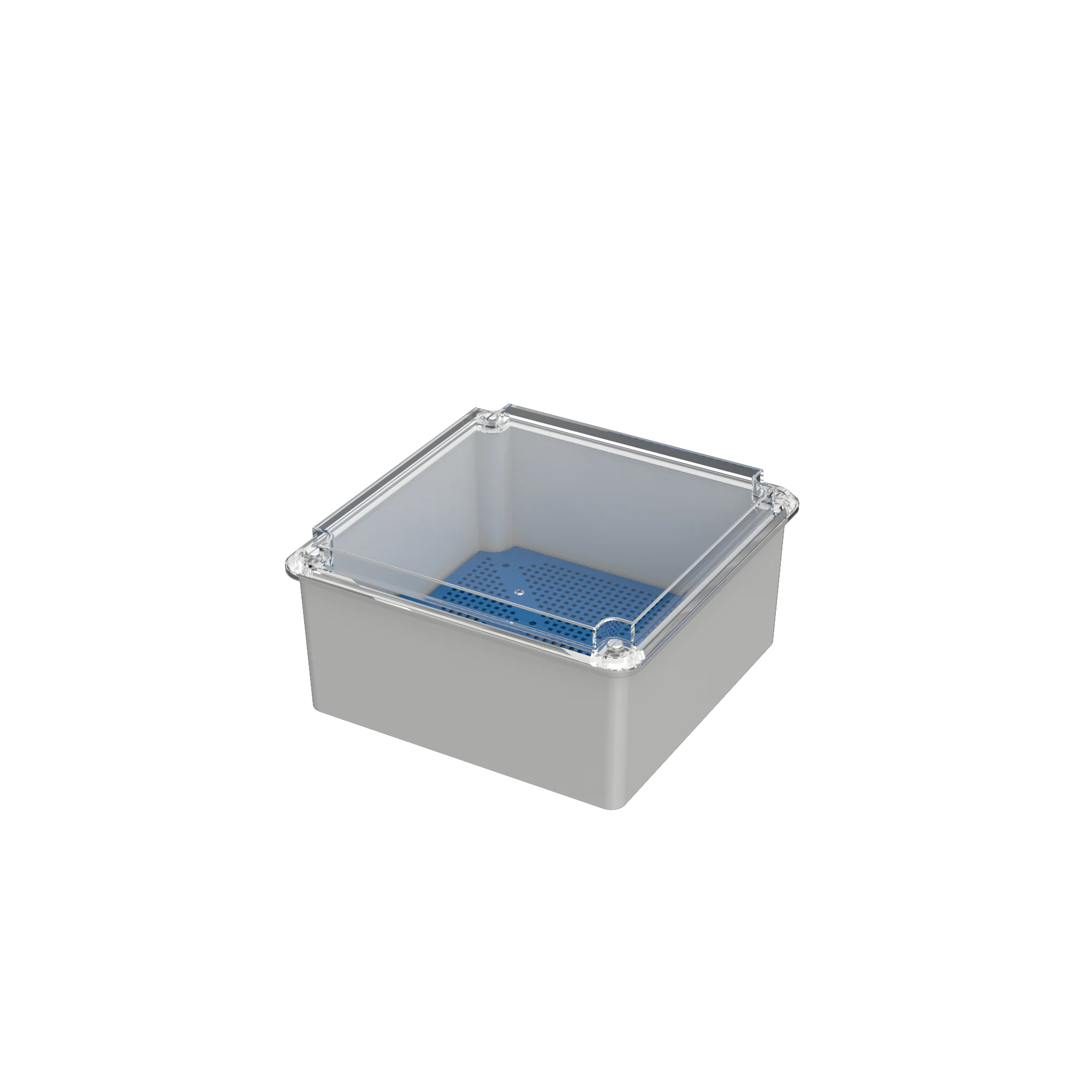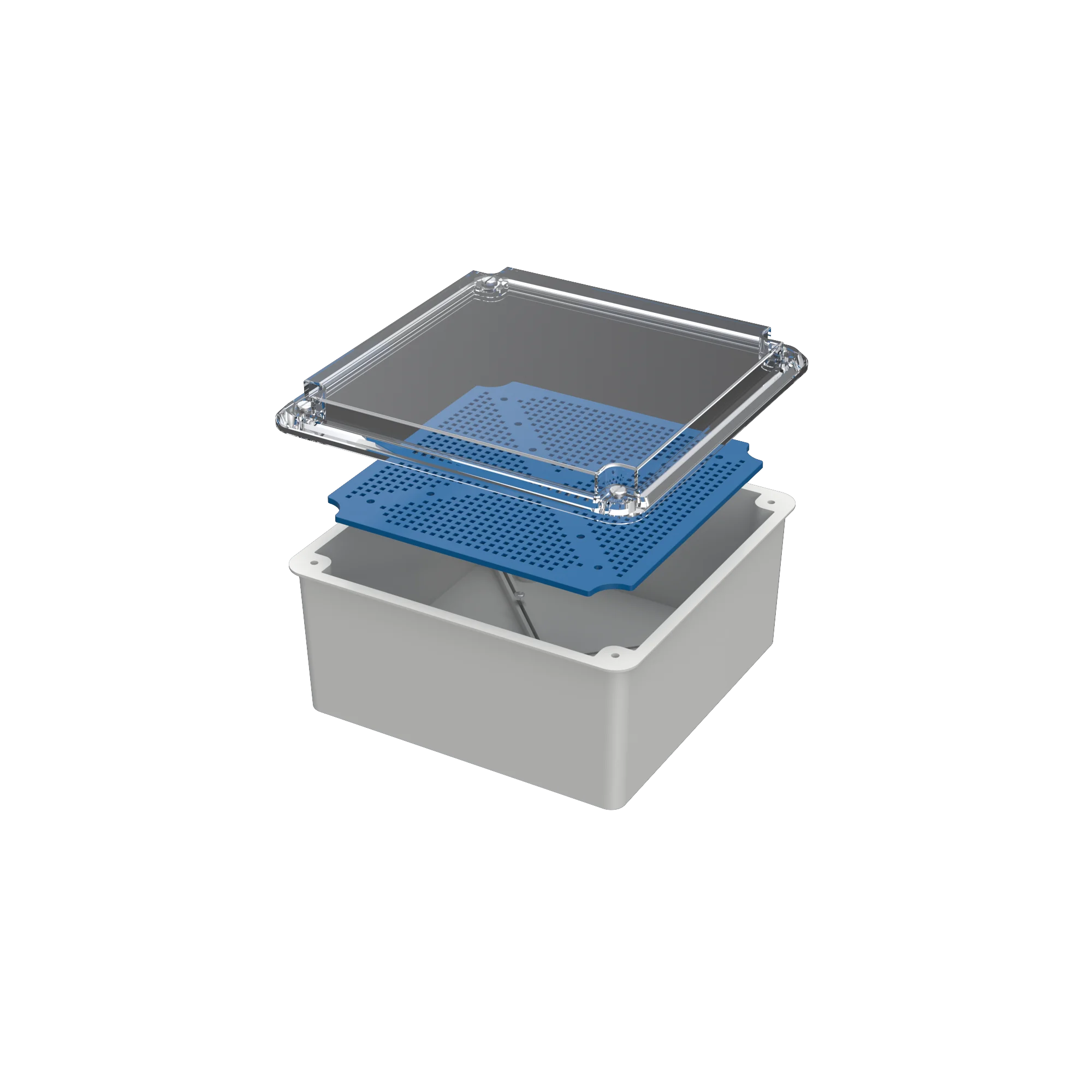 Caja de pase estanca, fabricada en material termoplástico auto extinguible. Con tapa transparente y bandeja perforada en su interior para el montaje de los elementos que requiera el instalador.