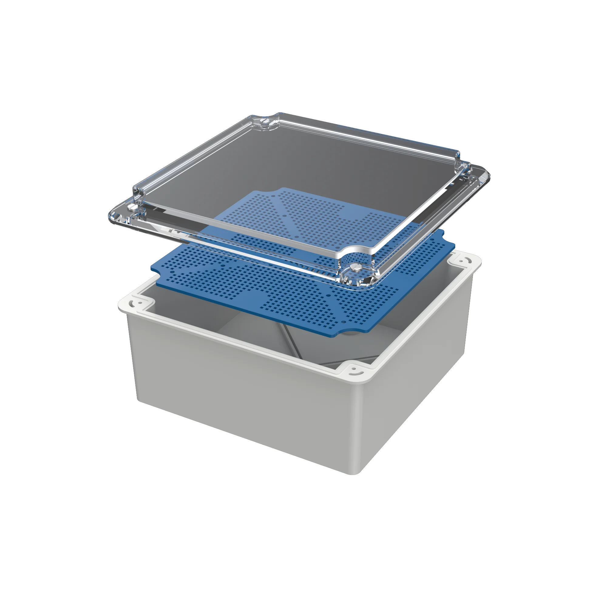 Caja de pase estanca, fabricada en material termoplástico auto extinguible. Con tapa transparente y bandeja perforada en su interior para el montaje de los elementos que requiera el instalador.