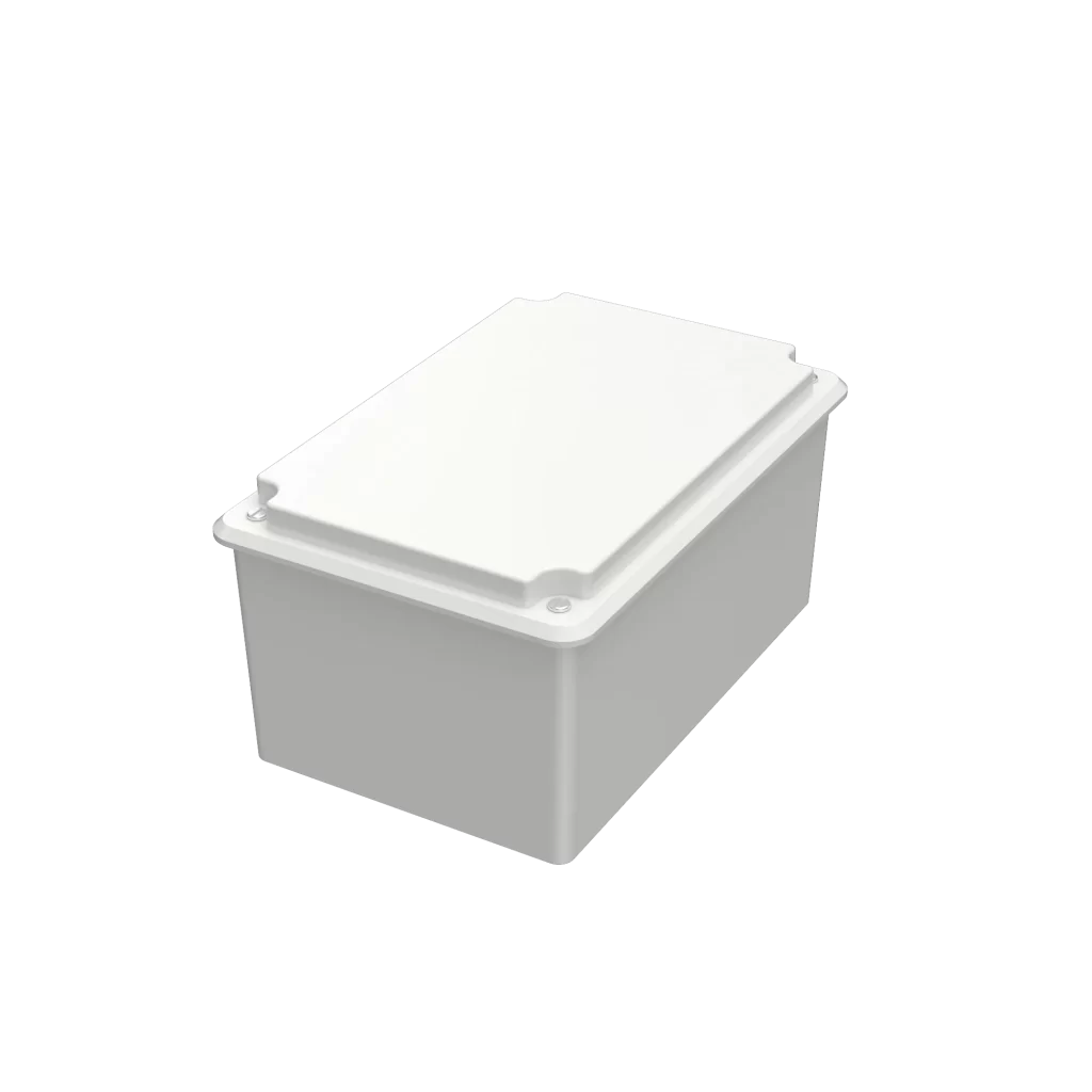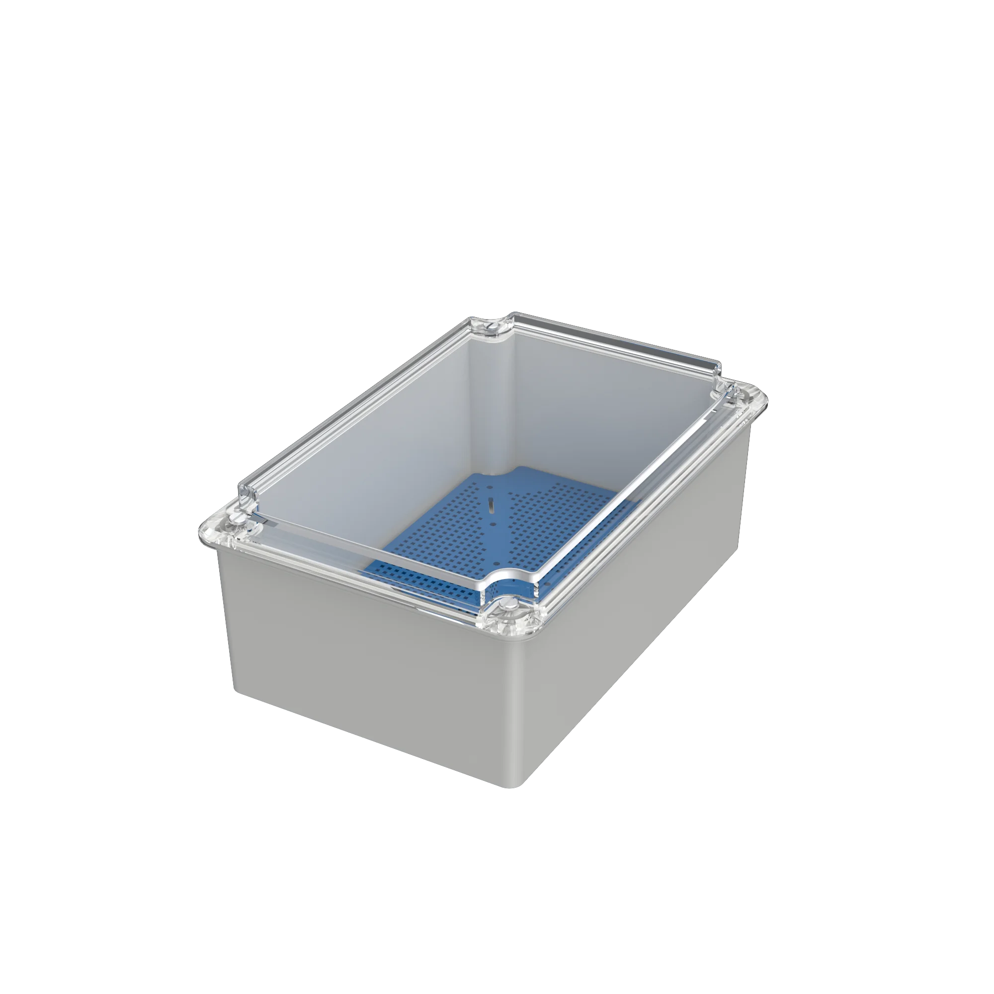 Caja de pase estanca, fabricada en material termoplástico auto extinguible. Con tapa transparente y bandeja perforada en su interior para el montaje de los elementos que requiera el instalador.