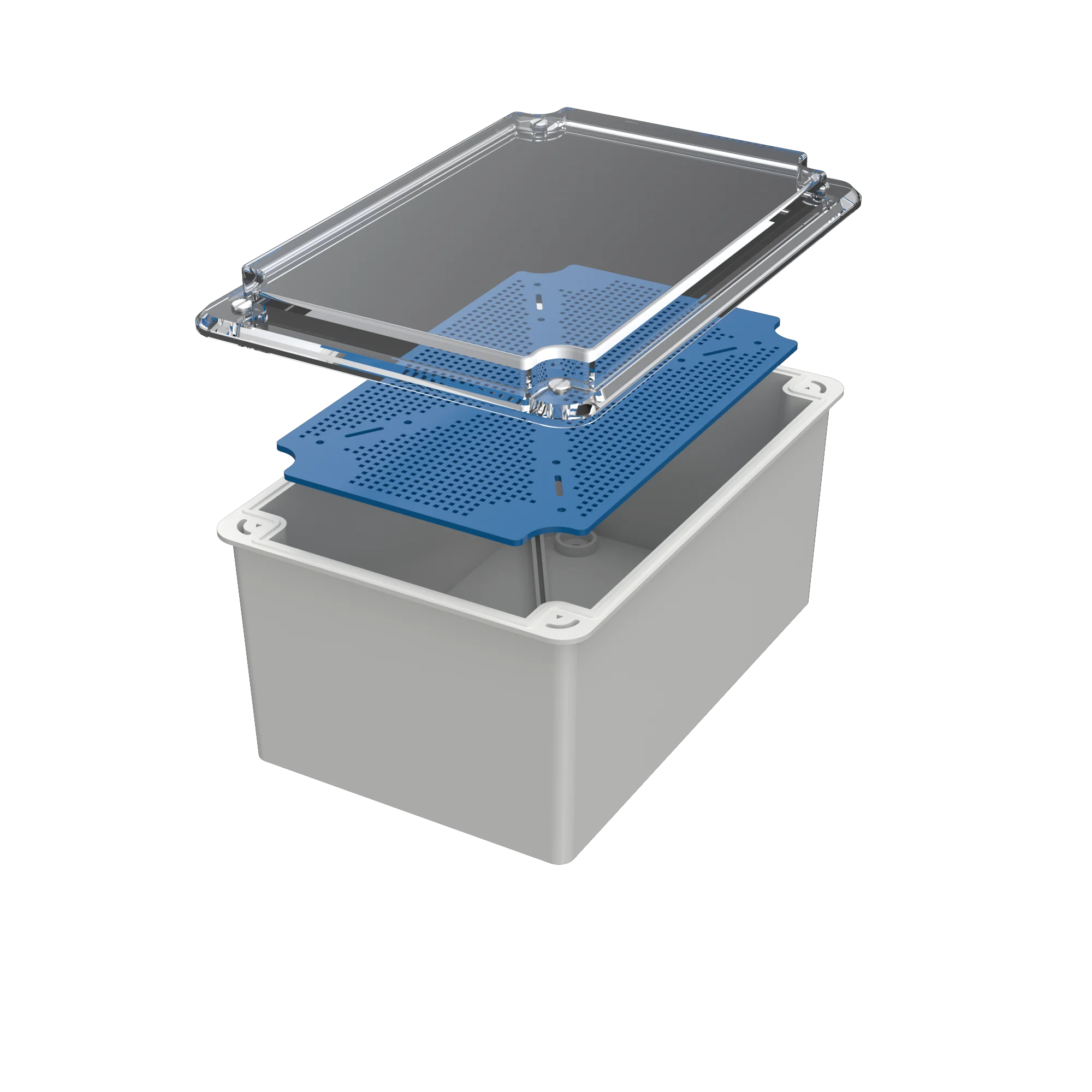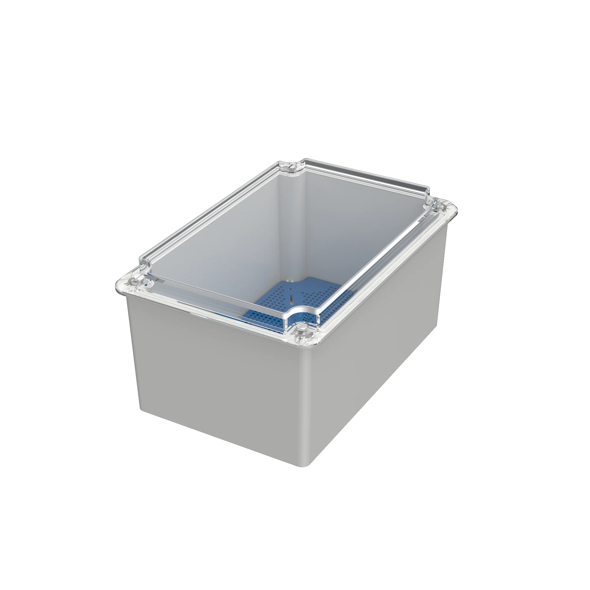 Caja de pase estanca, fabricada en material termoplástico auto extinguible. Con tapa transparente y bandeja perforada en su interior para el montaje de los elementos que requiera el instalador.
