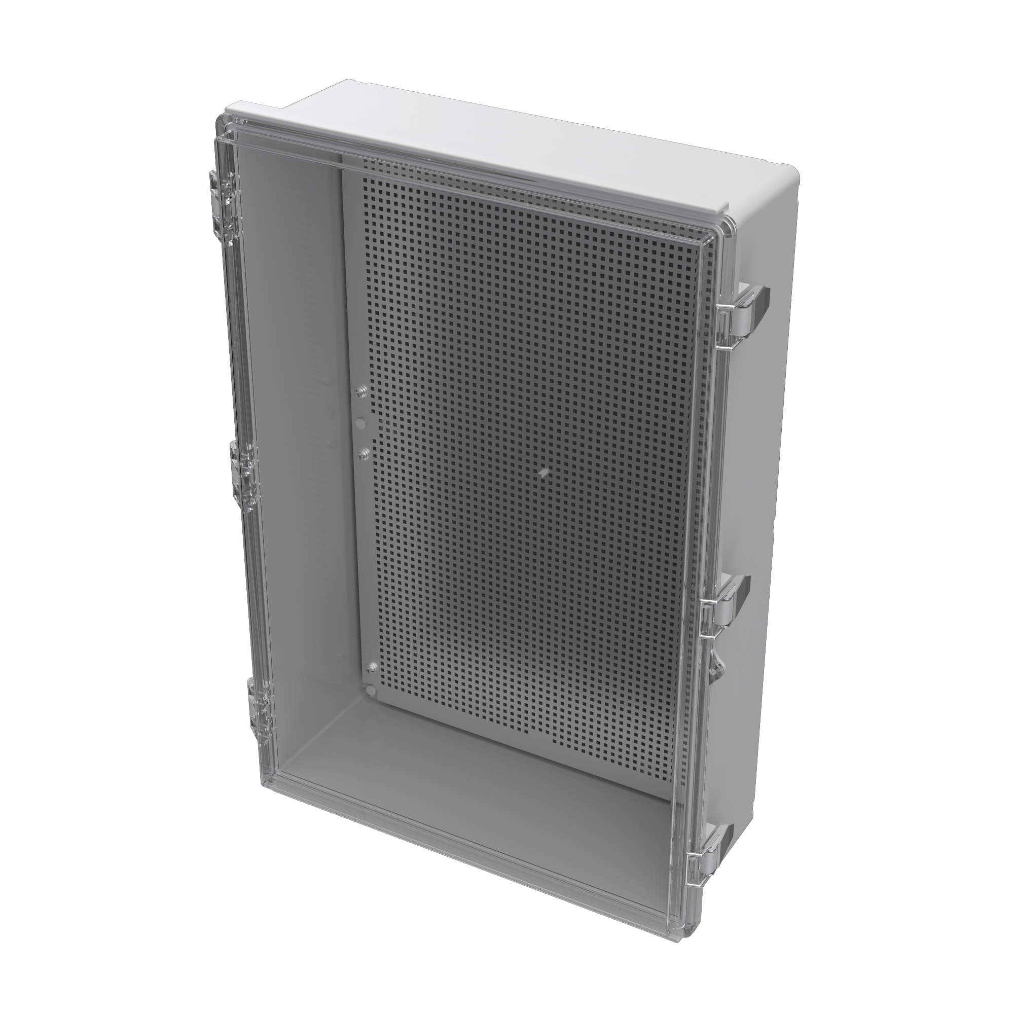 Gabinete con tapa transparente para uso eléctrico industrial o domiciliario, de apertura rápida mediante un innovador sistema de cierre por herrajes. Incorpora en su interior una práctica bandeja con múltiples perforaciones para el montaje de diferentes elementos de maniobra y control. Además, ofrece tres alternativas distintas de fijación a superficies, facilitando la tarea del instalador.