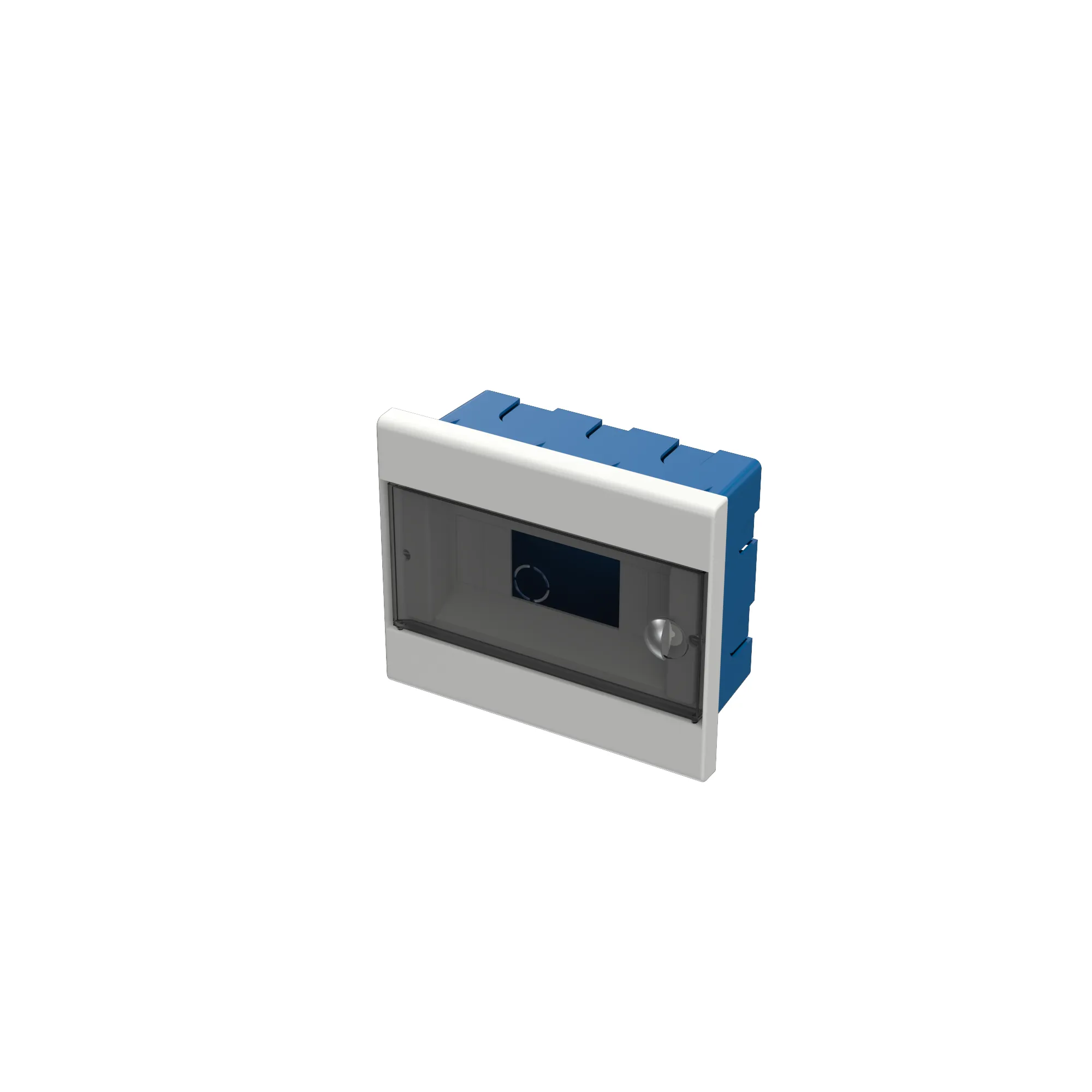 Caja en color azul, marco blanco y puerta fumé.